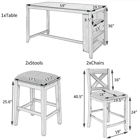 | Overall Product Dimension | Table: 59x29.5x36in.(LXWXH); Chair: 19.5x18x40.5in.(LXWXH); Stool: 17.5x13.2x25.6in.(LXWXH); |